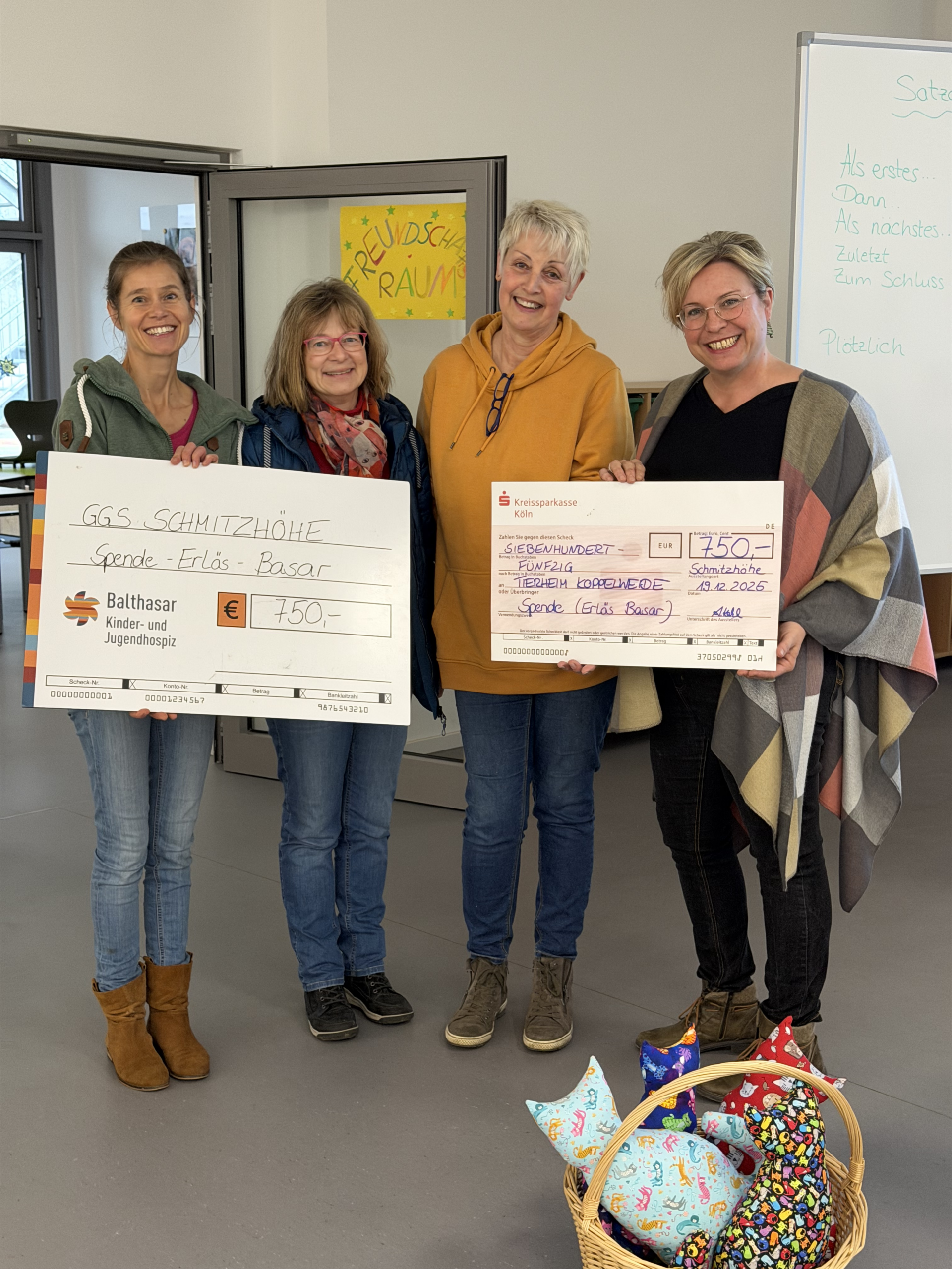Über die Verwendung der Spenden entschieden im Vorfeld im Rahmen einer Umfrage die Kinder und Eltern gemeinsam. Der gesammelte Betrag wurde deshalb anschließend gleichmäßig auf zwei Spendenziele aufgeteilt. So durfte sich das Kinder- und Jugendhospiz Balthasar über eine Spende freuen, die von Frau Mechsner entgegengenommen wurde. Ebenso erhielt das Tierheim Koppelweide eine Spende, die Frau Greb und Frau Lindemann stellvertretend entgegennahm. Als kleines Dankeschön erhielt jede Klasse einen Kalender und eine Stofftierkatze.
